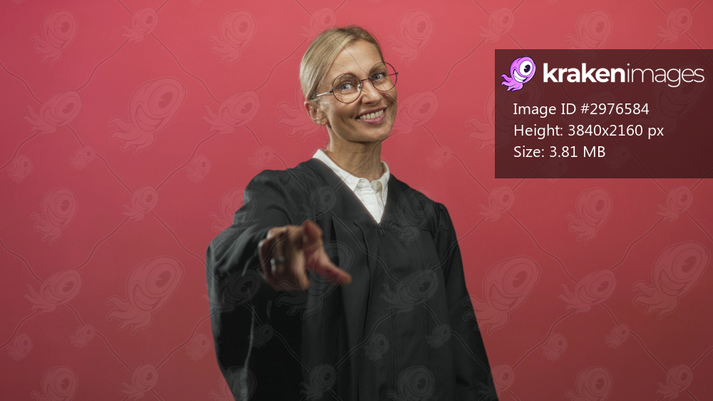 Woman judge in black robe wearing glasses smiles, points finger toward camera and forms a heart with hands in studio setting; warmth.