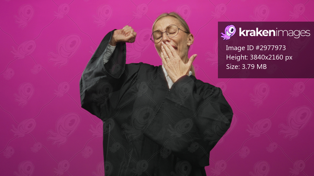 Woman judge in black robe yawning and covering her mouth with hand in a studio against a bright pink backdrop; tiredness duty.