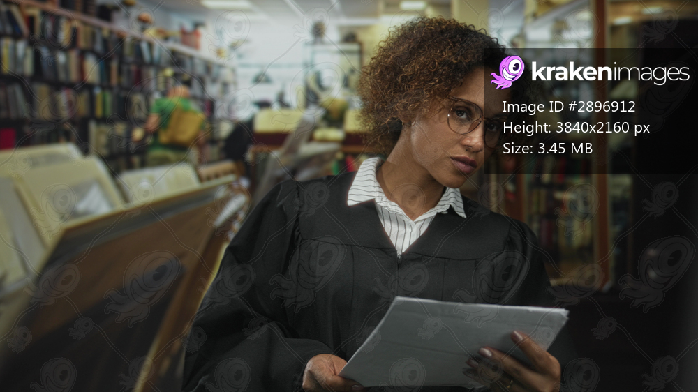 Woman judge in judicial robe wearing glasses reads and holds court papers while standing amid bookshelves in a library; seriousness duty.