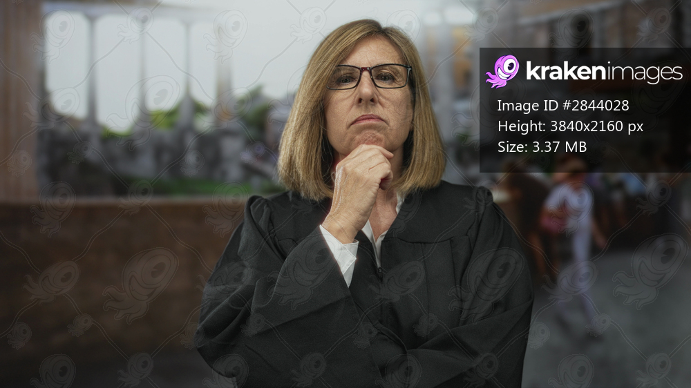 Woman judge in robe with hand on chin in sunlit roman ruins building; thoughtful pondering doubt introspection.