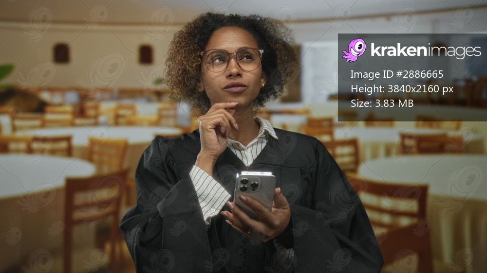 Woman judge in robe holding smartphone with hand on chin reading screen in building restaurant hall; justice contemplation decision.