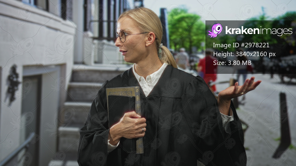 Woman judge in robe holds book to chest and gestures with hand on a street; authority justice duty leadership.