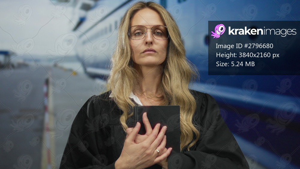 Woman judge in uniform holding book on seaside port background near large boat outdoors, exuding confidence and authority.
