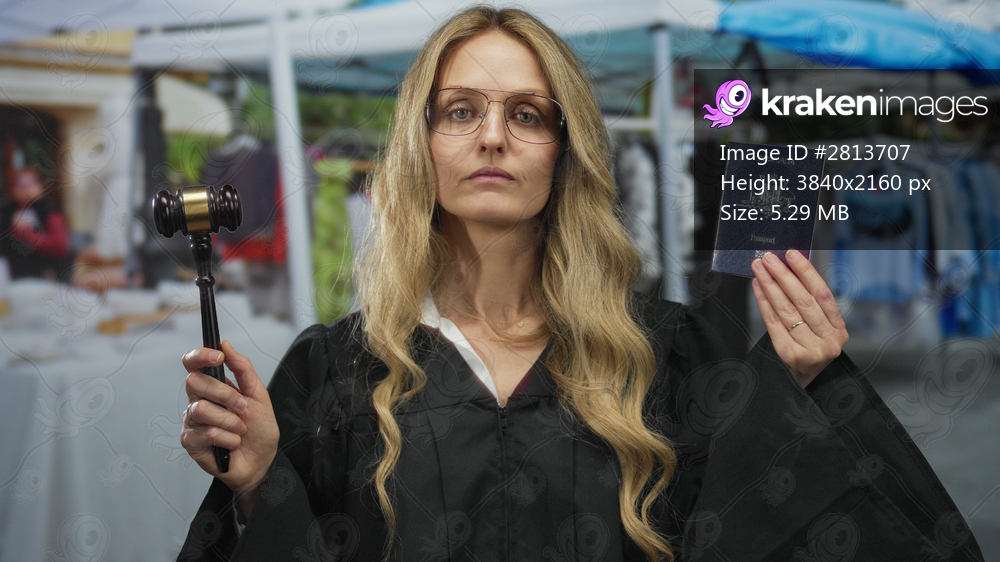 Woman judge in uniform holding gavel and australian passport standing in outdoor market street with shop background.