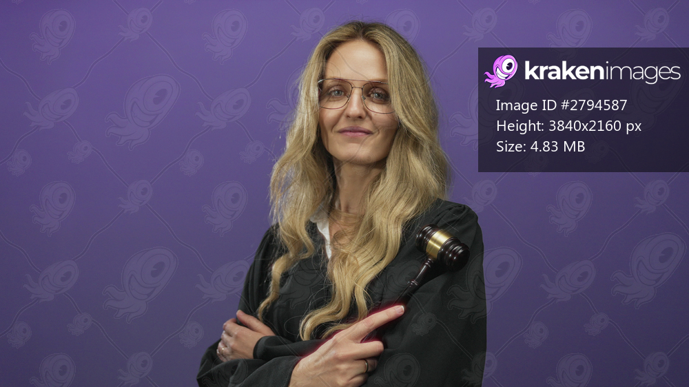 Woman judge in uniform holding gavel in front of isolated purple background, exuding confidence and authority with a poised expression, conveying justice and law concept. - Kraken Images