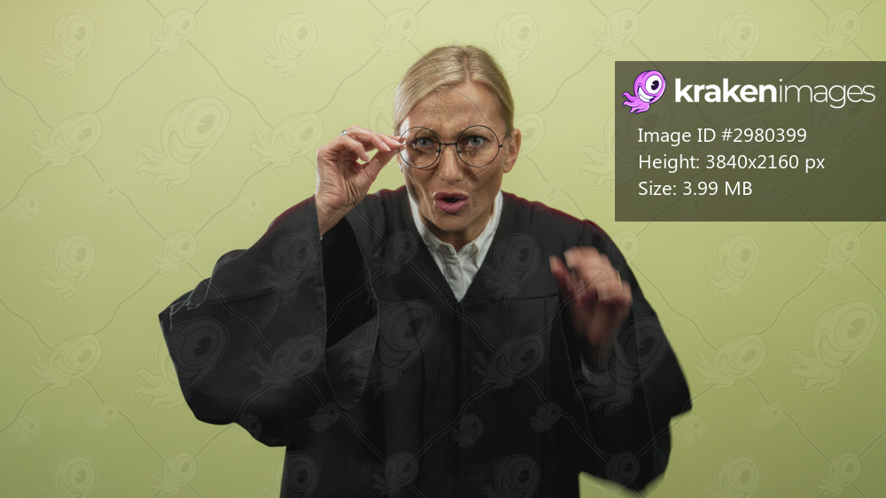 Woman judge, middle age blonde, adjusts glasses with a pinching hand gesture and open mouth expression facing camera in studio; surprise scrutiny.