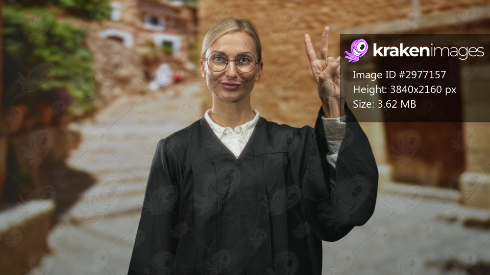 Woman judge, middle age blonde with glasses, wearing a black robe, raises two fingers in a victory sign while smiling on a historic stone street with stairs and doorway; pride celebration. - Kraken Images