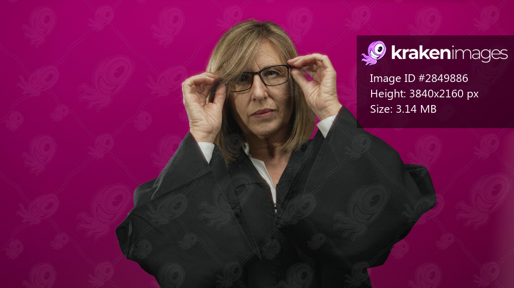 Woman judge middle age caucasian removes glasses in pink studio setting with solemn expression; fairness justice seriousness integrity.