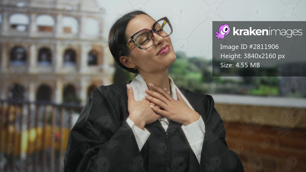 Woman judge outdoors near the roman coliseum extending arms happily in black robe, capturing a moment of warmth and cheerfulness in a city setting.
