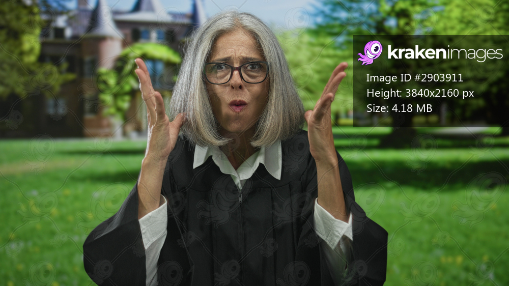 Woman judge raises hands and gestures with open mouth in front of castle building in green park; frustration authority.