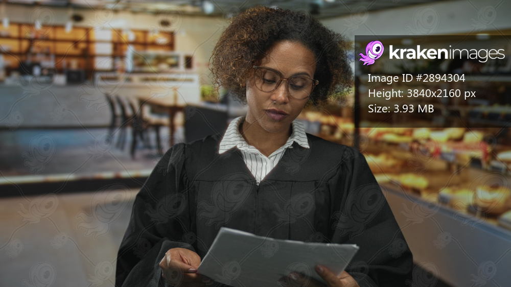 Woman judge reading papers in a bakery coffee shop indoors, holding document and wearing judicial robe; concentration duty justice.
