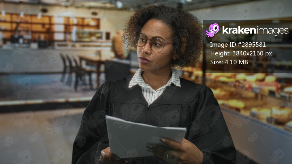 Woman judge reading papers in a bakery coffee shop indoors, holding document and wearing judicial robe; concentration duty justice.