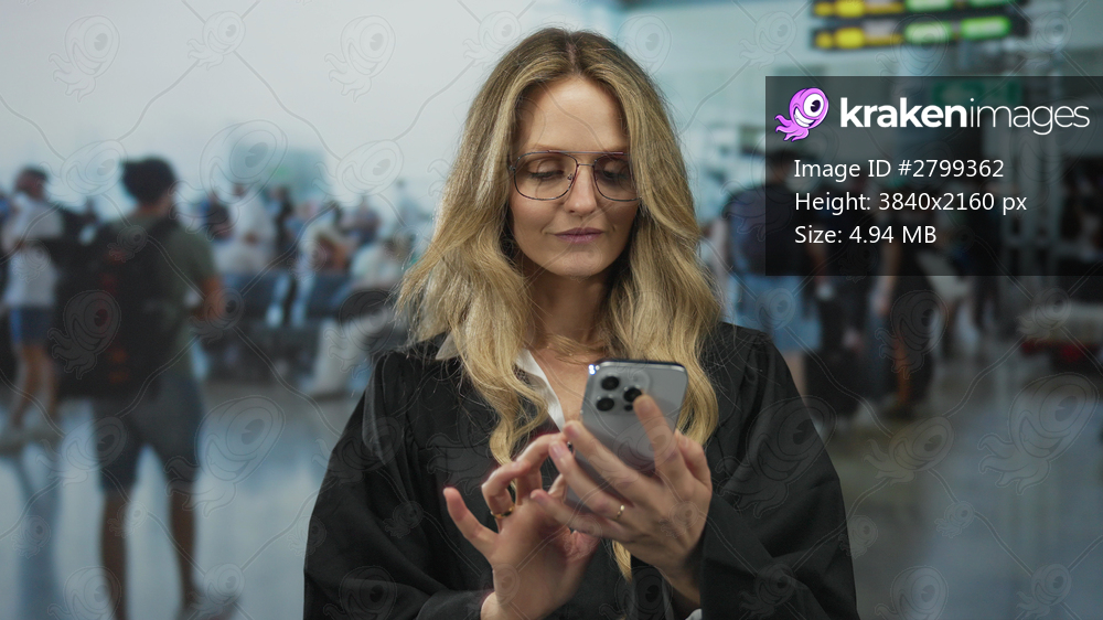 Woman judge with smartphone at busy airport terminal, young and blonde in uniform focused indoors on device amidst crowd.