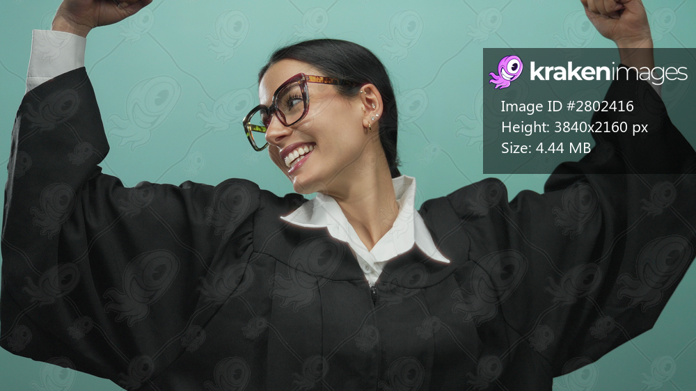 Woman judge smiling confidently in black robe with glasses over isolated blue wall background.