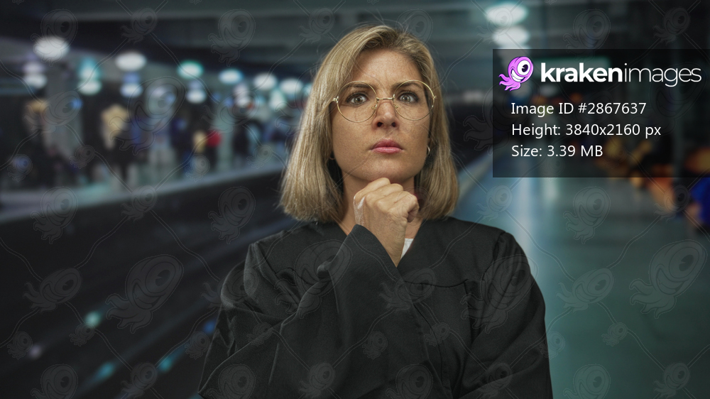 Woman judge wearing black robe covering mouth with hand inside station building platform; concern safety.