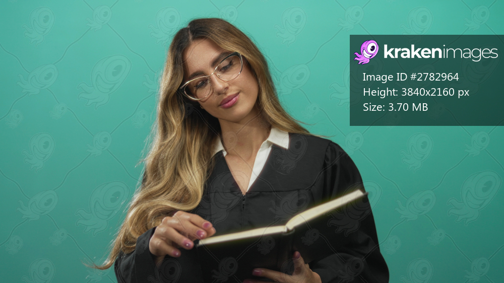 Woman judge wearing black robe and eyeglasses turns pages of a law book in a green studio setting; justice learning reflection.