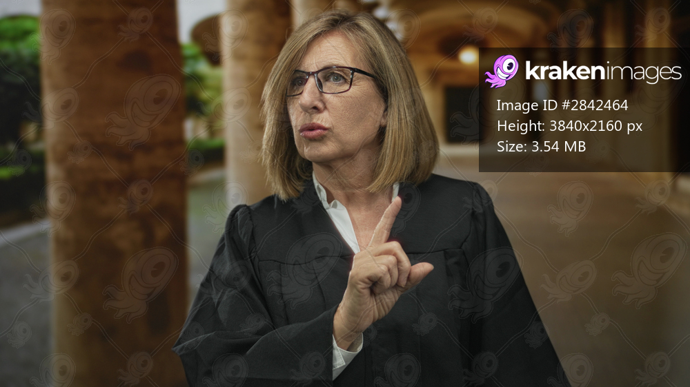Woman judge wearing black robe and glasses points finger in old town street; authority determination.