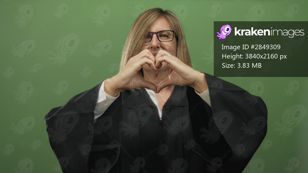 Woman judge wearing black robe and glasses smiling and forming heart shape with hands in studio; love.