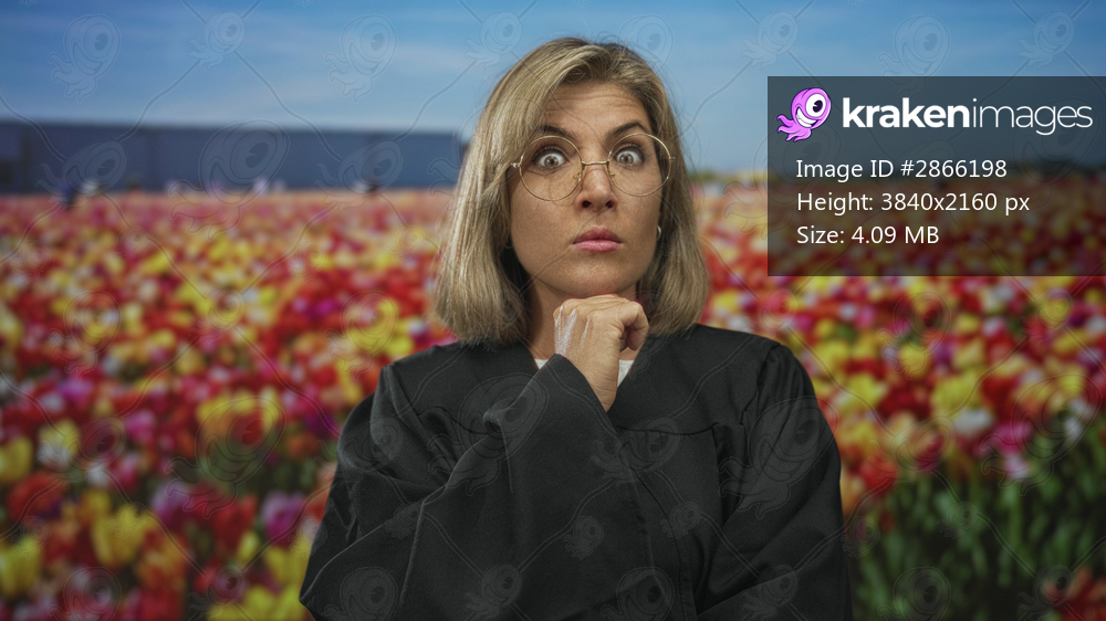 Woman judge wearing black robe with hand on chin gesture against a sharp colorful flower field in studio lighting; doubt.