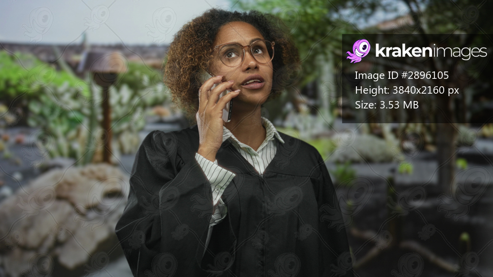 Woman judge wearing black robe holding phone to ear, glancing upward while standing in street among trees and rocks; confidence leadership.
