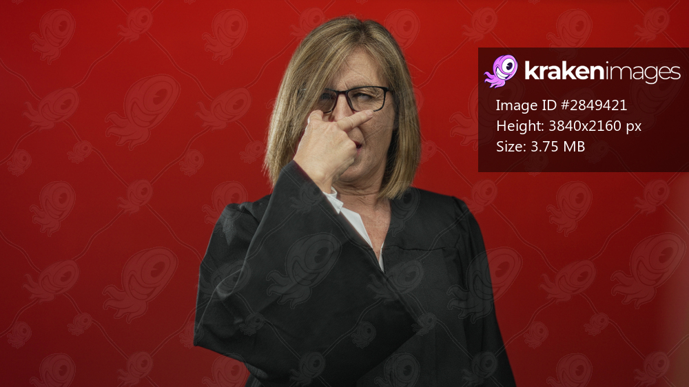 Woman judge wearing black robe presses finger to nose in studio with sharp red wall; vigilance authority.