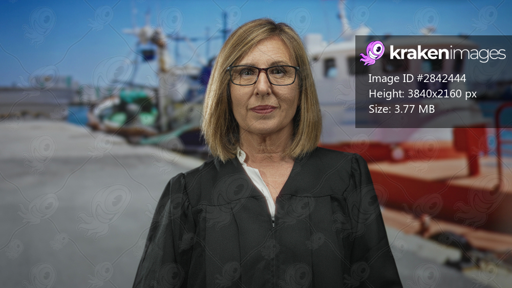 Woman judge wearing black robe stands in front of docked boat at building; authority confidence resolve.