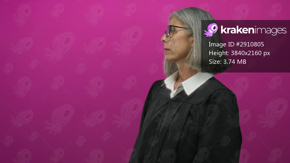 Woman judge wearing black robe and white collar with glasses looking sideways in studio with pink backdrop; authority justice leadership respect.