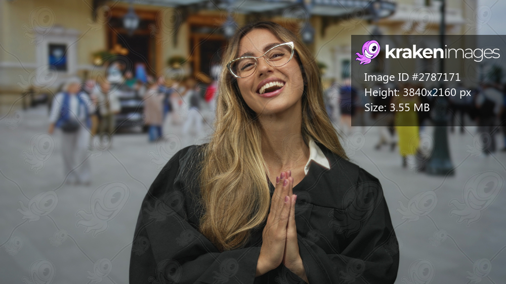 Woman judge wearing eyeglasses shows open palms gesture at historic courthouse plaza; celebration success excitement pride.