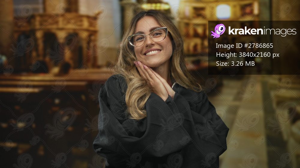 Woman judge wearing glasses with hands clasped in prayer inside cathedral; devotion faith serenity sanctity.