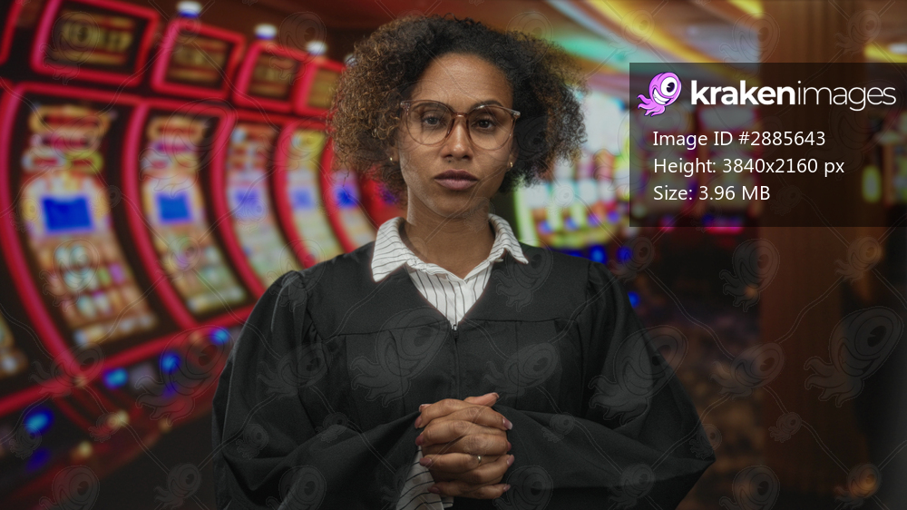Woman judge wearing glasses in black robe clasping hands near slot machines in casino building; quiet determination.