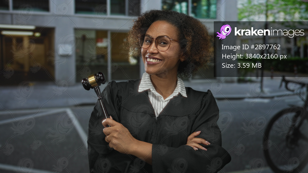 Woman judge wearing robe and glasses holding gavel with arms crossed and smiling on city street; confidence authority leadership.