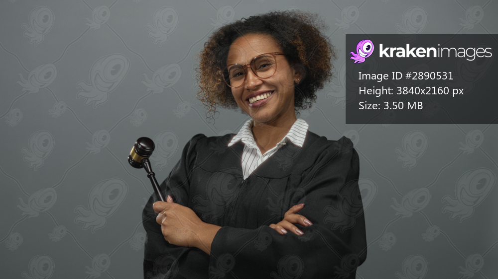 Woman judge wearing robe and glasses smiling while holding gavel and arms crossed in grey studio; confidence authority.