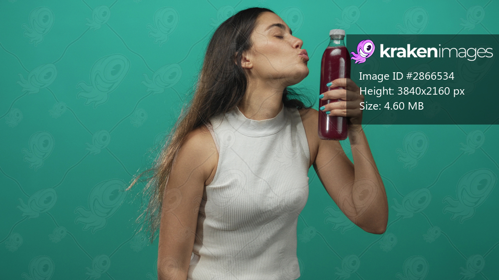 Woman kisses large glass drink bottle in bright studio against solid green background; refreshment vitality joy.