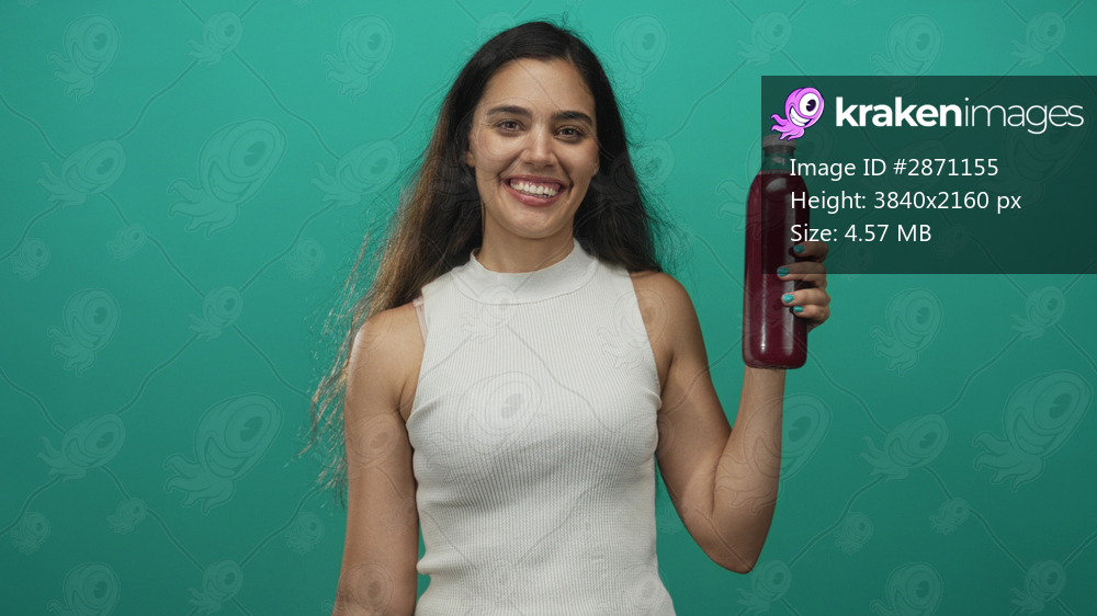 Woman kisses large glass drink bottle in bright studio against solid green background; refreshment vitality joy.