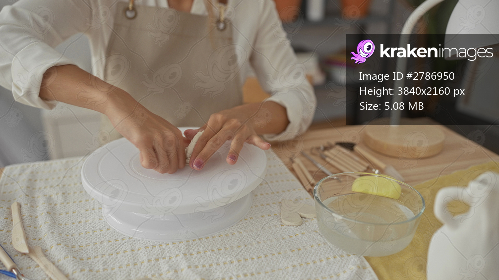 Woman kneads clay with her bare hands on a spinning wheel in a pottery studio while wearing a beige apron; calm focus creativity.