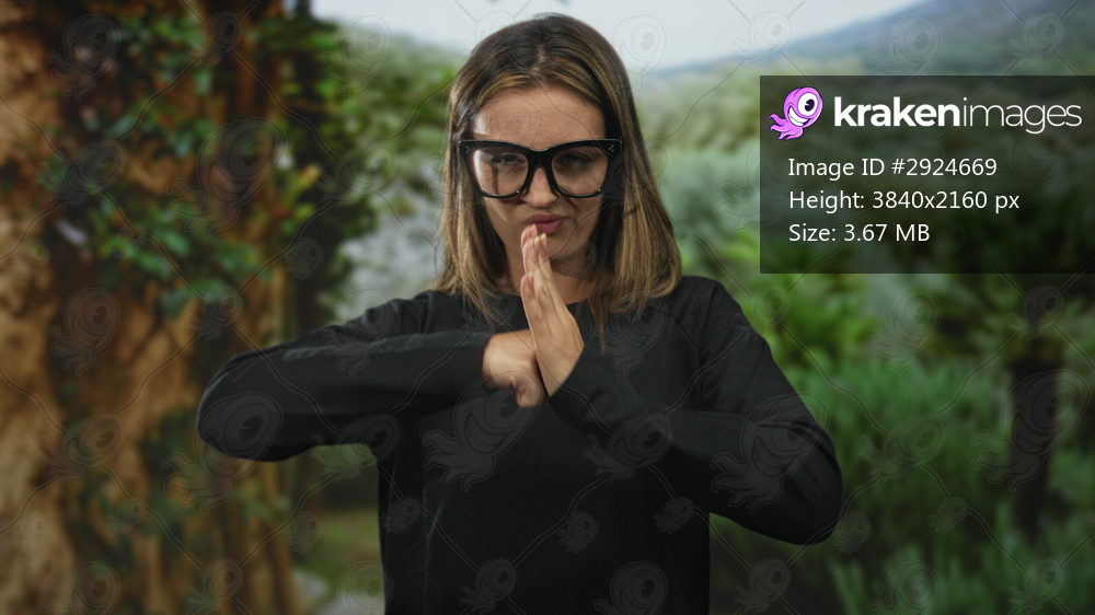 Woman with large black glasses and black shirt clasping hands and making a pouty face in a forest; playful defiance.