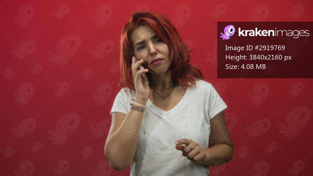 Woman latin young holding smartphone and tapping screen in red studio wall, wearing white t shirt and rings; concern focus.