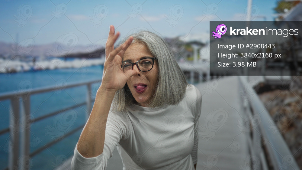 Woman laughing with arms crossed on a sunny street pier beside moored boats and a white marina building; joy freedom travel.
