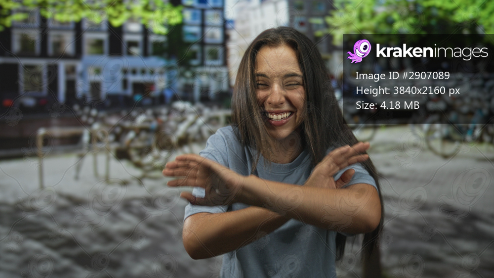 Woman laughing with arms crossed over chest on a city street, hands visible and bare forearms exposed; joy.
