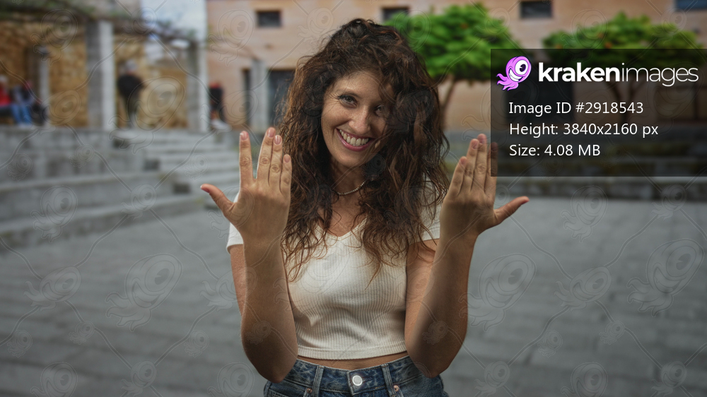 Woman laughing and beckoning with palms in a street plaza in front of a building; joyful invitation.