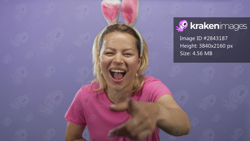 Woman laughing with bunny ears headband and bright pink shirt gestures toward camera in studio; joy.