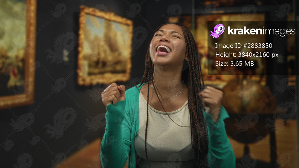 Woman laughing with clenched fists in an art gallery building, braided hair and green cardigan visible; joy celebration wonder.