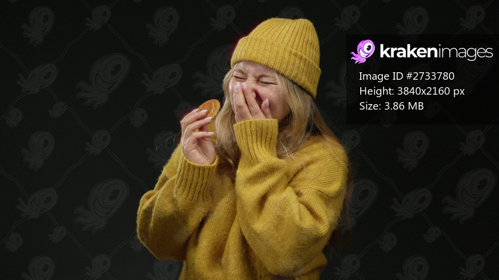 Woman laughing, covering mouth, holding cookie, wearing, yellow sweater, and hat, on black background, conveying warmth, and joy.