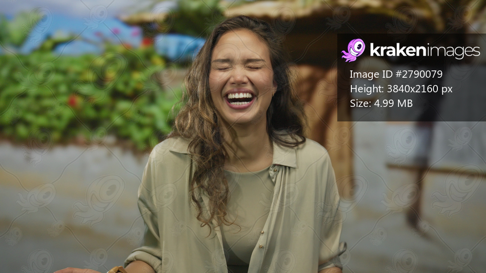 Woman laughing expressively outdoors, showing joy with tropical foliage and vibrant background in a sunny outdoor setting.
