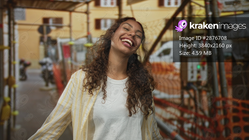 Woman laughing with eyes closed and hands on hips at building scaffolding with orange safety netting and delivery van behind; joy confidence.