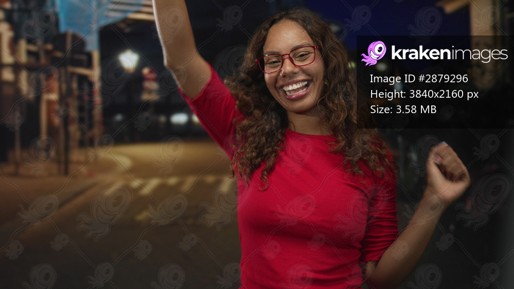 Woman laughing with glasses and arms raised on street at night in red shirt smiling broadly and dancing; joy celebration.