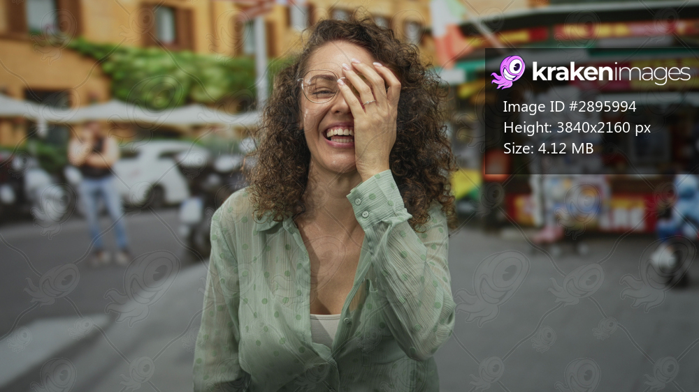 Woman laughing with hand covering face on busy street wearing glasses and a green blouse, curly hair framing her face; joy.