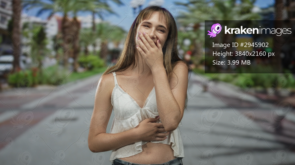 Woman laughing with hand covering mouth and hand on navel showing bare midriff in white top and denim shorts on sunny street lined with palm trees; youthful joy. - Kraken Images