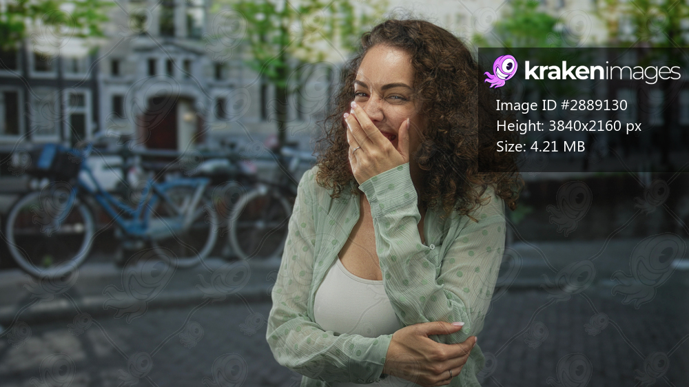 Woman laughing with hand covering mouth on amsterdam street by canal and bicycles; joy spontaneity now.