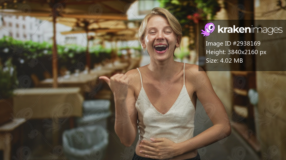 Woman laughing with hand on chest at street cafe terrace, pointing and clutching stomach amid outdoor tables and umbrellas; joy gratitude warmth.